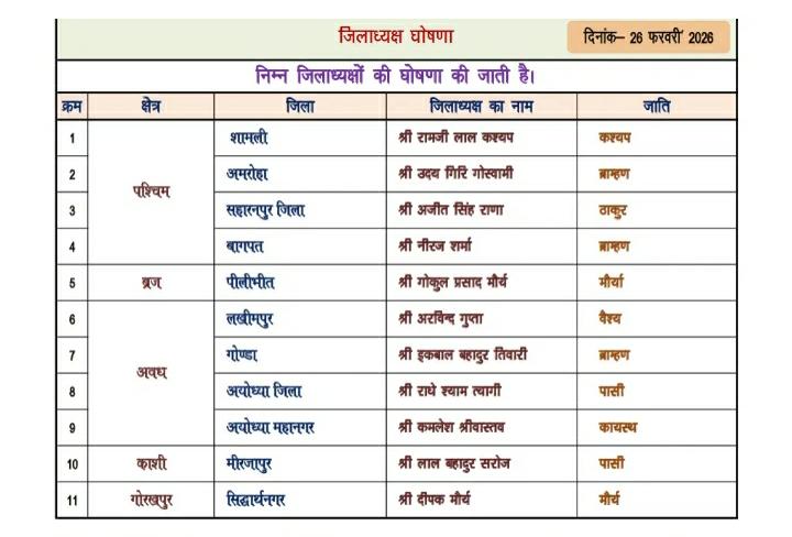 अवध क्षेत्र में अयोध्या जिला में राधेश्याम, अयोध्या महानगर की कमान कमलेश श्रीवास्तव को सौंपी गई है। वहीं गोंडा में इकबाल बहादुर तिवारी व लखीमपुर में अरविंद गुप्ता को अध्यक्ष पद की जिम्मेदारी दी गई है। काशी क्षेत्र में मिर्जापुर का जिलाध्यक्ष लाल बहादुर सरोज को बनाया गया है। ब्रज क्षेत्र में पीलीभीत जिले की कमान गोकुल प्रसाद मौर्य को दी गई है। पश्चिम क्षेत्र के शामली जिले में रामजी लाल कश्यप, अमरोहा में उदय गिरी गोस्वामी, सहारनपुर में अजीत सिंह राणा व बागपत में नीरज शर्मा को जिलाध्यक्ष घोषित किया गया है।